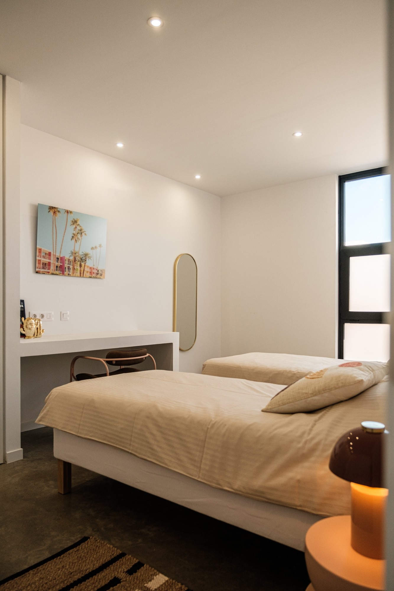 Une option plus économique qui permet de partager une salle de bain (pour deux chambres) tout en profitant d'un hébergement confortable. Notez que cette option profite d’une aile à part dans la villa avec sa propre terrasse et cuisine. La chambre est modulable avec deux lits simples ou un lit double.